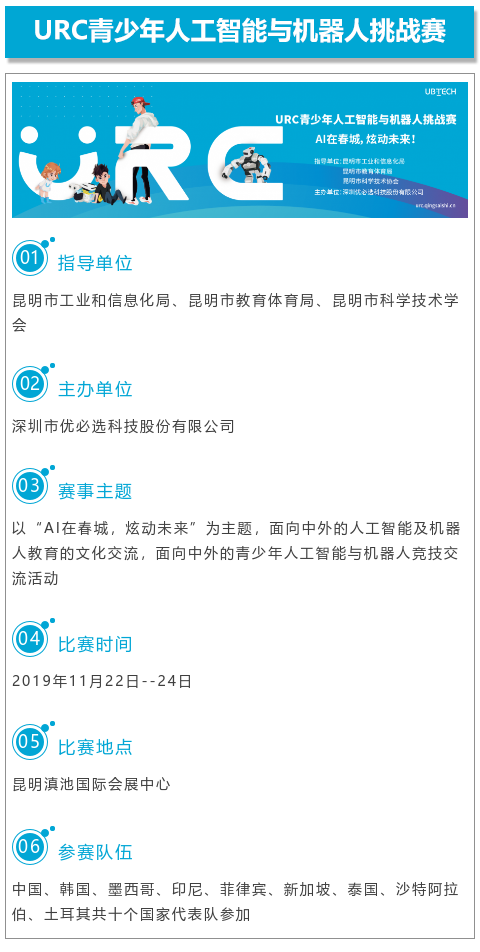 2019年11月22日至11月24日,在中国昆明滇池国际会展中心举办的“URC青少年人工智能与机器人挑战赛”总决赛上,你将观看到这些神奇机器人的精彩表演。比机器人更精彩的是,来自全球的560余名青少年选手将共聚一堂,大展身手,让创意尽情释放!
