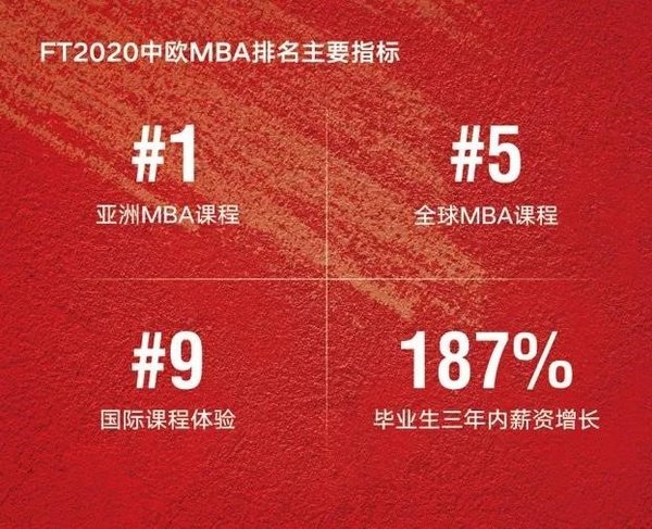 1月27日,英国《金融时报》(Financial Times)公布了2020年全日制MBA课程全球百强排行榜,中欧国际工商学院MBA课程再次高居全球第五、蝉联亚洲第一。2019年11月,中欧Global EMBA课程也在《金融时报》排行榜中再次稳居全球第五。