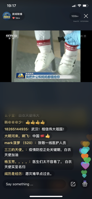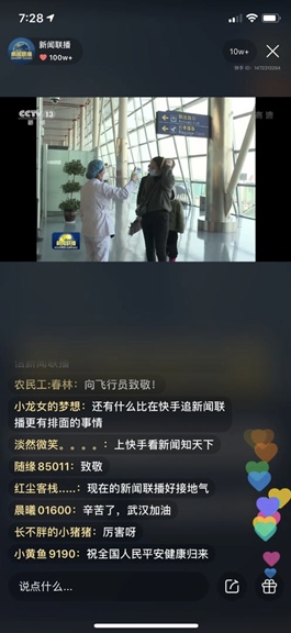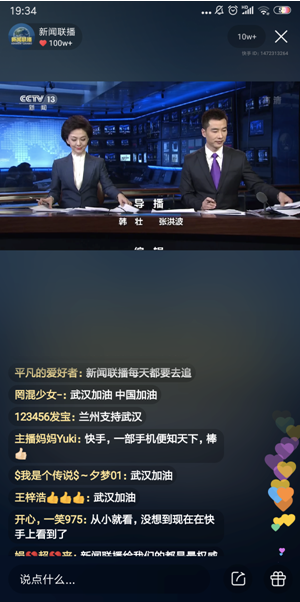 在全国上下抗击疫情的关键时刻,《新闻联播》作为最权威的新闻节目在快手上同步直播,不仅让网友可以第一时间获取最权威、最准确的疫情信息,还及时消除了恐慌增强了信心。一周来,网友们透过《新闻联播》,知晓了中央政治局常委会、国务院常务会议的最新精神,了解到中央赴湖北指导组的最新工作动态,以及掌握了全国各地奋力阻击疫情的各项举措,并被一个个医护人员舍小家为大家的感人事迹所深深打动。