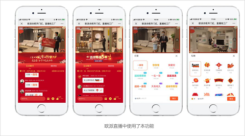 欧派直播活动中,盟主直播在直播界面下方添加了滚动广告,让用户对欧派主推的各种定制化家居产品及价格一目了然,并且用户通过广告点击可直接跳转至产品购买页面,大大提高了商品的购买率。