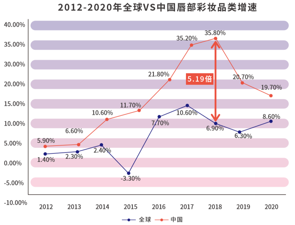 2018年全球唇部彩妆市场规模已达167亿美元。近一年间,全球销售额前十的口红品牌一共卖出3400万支口红,创下44.6亿元销售额。在国内,阿里平台的口红类产品一年突破106亿元成交额。全年口红销量之中,产地在中国的产品占半数,创下47亿元销售额。