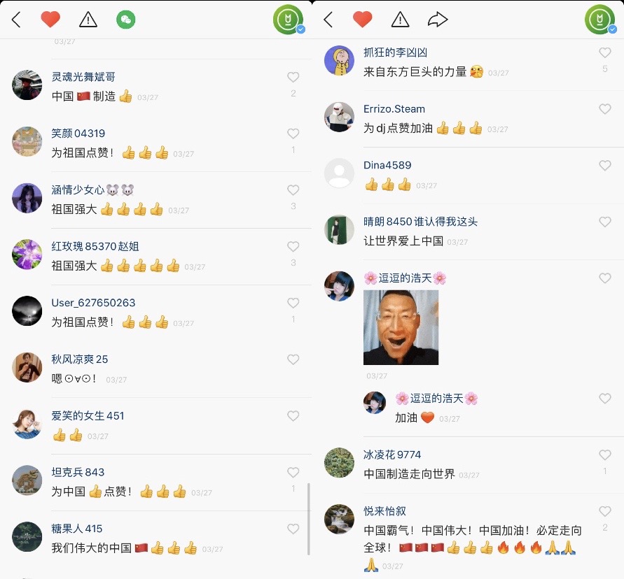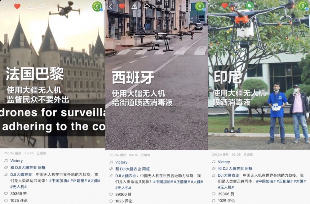 在“DJI大疆农业”(快手ID:DJI_666666)发布的快手视频中,记录了中国制造的大疆无人机在世界各地助力战疫的场景。巴黎的警察操控无人机上升,飞过塞纳河畔,监督民众不要外出;西班牙空荡的商业街上空,无人机正在执行喷洒消毒液的工作;在印尼,无人机也成为了消杀好帮手。视频不仅获得了210w播放量,老铁们也纷纷留言:“大疆大疆,为国争光”“来自东方巨头的力量”......