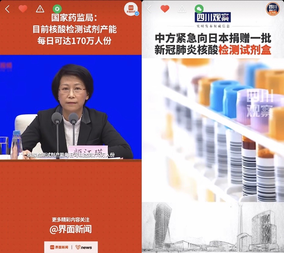 据界面新闻(快手ID:739573253)此前报道,我国医用防护口罩日产量达84.4万个,核酸检测试剂产能每日可达170万人份。与此同时,当得知日本核酸检测试剂盒不够后,中方紧急向日方捐赠一批试剂盒。