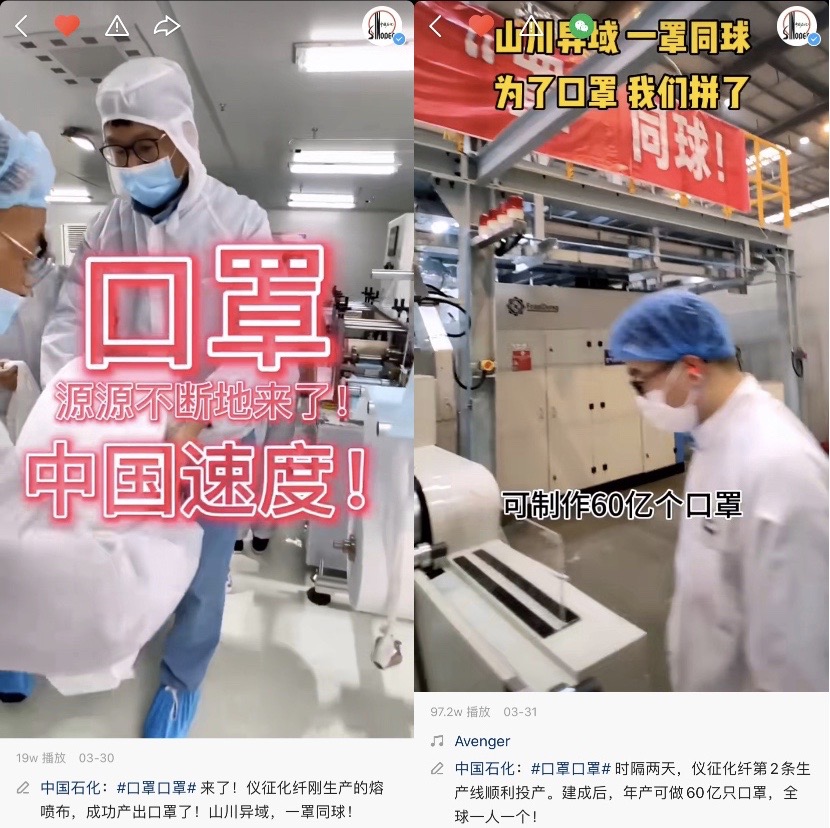 “口罩源源不断地来了!”在中国石化(快手ID:sinopecgroup)的快手视频中,记录了3月29日仪征化纤首条熔喷布生产线正式投产画面。该生产线日产量1吨多,可供制造100万只医用口罩。这意味着,当12条生产线全部投产后,每天可制造1800万只口罩。“这就是中国速度!”“天壤之别的科技时代”,视频下老铁们纷纷留言,为中国科技点赞。