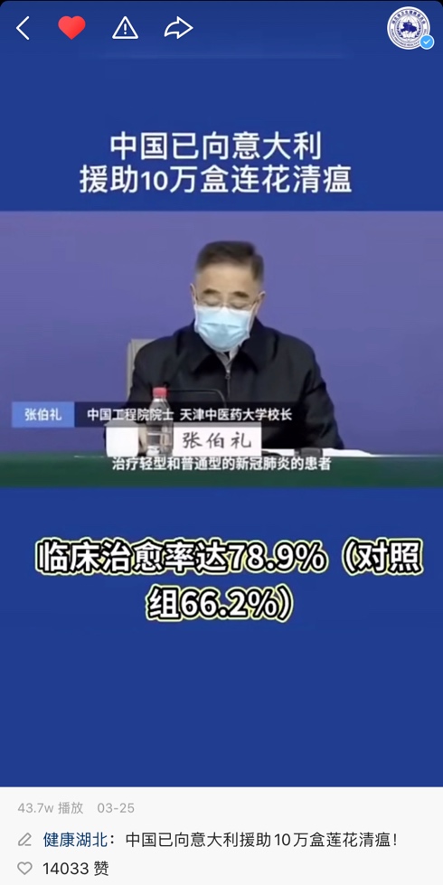 不仅是前期的宣传预警和防护,有效的治疗方案也能缓解全球疫情的燃眉之急。据“中新社国是直通车”(快手ID:1590173583)报道,中国工程院院士张伯礼表示,莲花清瘟对治疗轻型和普通型的新冠肺炎患者有确切的疗效。目前,我国已向意大利援助10万盒莲花清瘟。
