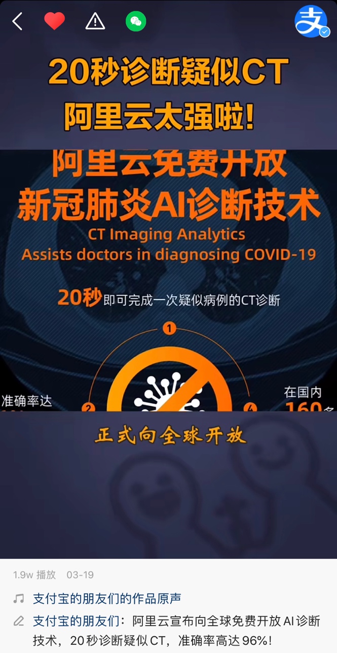 不久前,阿里云向全球医院免费开放新冠AI诊断技术,20秒即可完成一次疑似病例的CT检测,准确率达96%。“这真是大大减轻了一线医务人员负担” “希望别的国家能早点用上这个技术”,评论区老铁们的自豪感油然而生。
