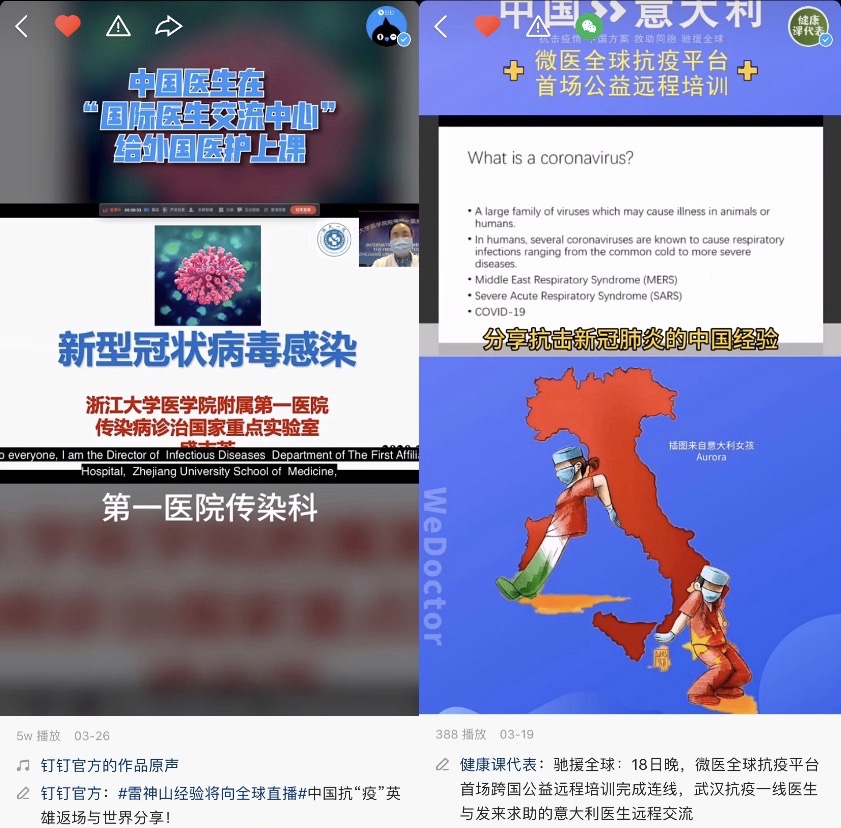 交流医疗经验也是全球共抗疫情的重要环节。“大家好,我是浙江大学附属医院感染科重点实验室主任盛洁芳。”通过钉钉(快手ID:dingtalk345 )群直播,中国抗“疫”英雄返场,在全球新冠肺炎实战共享平台“国际医生交流中心”与外国医生交流经验,将雷神山经验与世界分享。