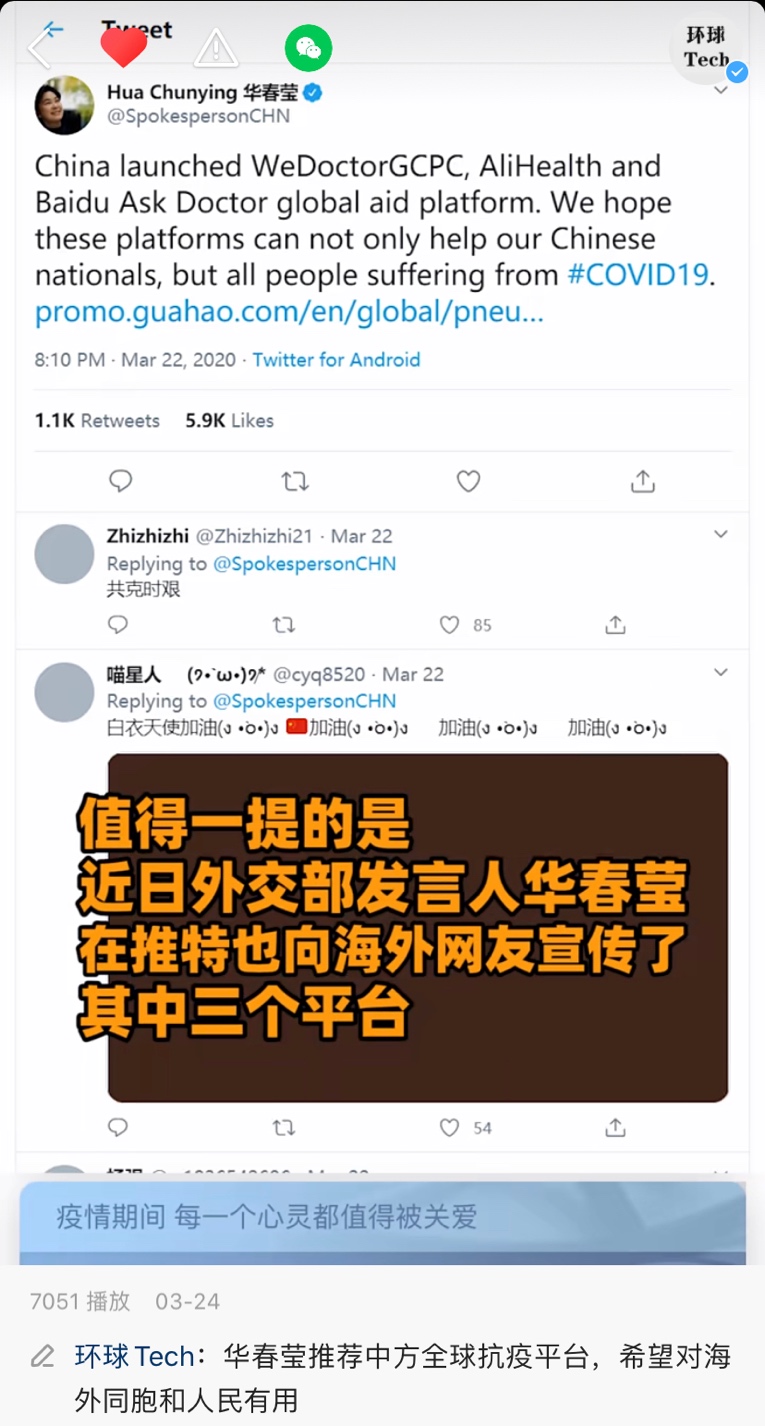 近日,外交部发言人华春莹在推特向海外网友宣传三个交流平台:微医互联网总医院全球抗疫平台、阿里健康海外侨胞在线医疗咨询专区和百度问医生全球公益援助平台,希望借助多平台交流,更好助力全球携手共抗疫情。