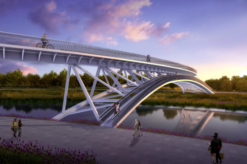 该桥位于成都市三环以南,绕城高速北侧,由中建科工承建,桥梁全长为1029.91m,作为锦城绿道的“空中纽带”,造型上融入轻盈、柔美、生态等主题元素,串联两端自然公园、特色小镇等景观资源,与周边环境融为一体。“该桥跨河道、市政主干道施工,线行轻盈灵动极富设计感。采用全钢结构的形式,现场装配施工,可以有效缩短建设周期。”项目生产经理李磊介绍到。