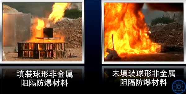 该“球形非金属阻隔防爆材料”应用于石油、危险化学品的储存、运输、油气输送管线等领域。可解决因交通事故、安全生产带来的财产损失和人员伤亡问题,确保社会和谐和国家经济平稳运行,具有重要的安全和社会效益。根据GB14372-2005《危险货物运输爆炸品分级实验方法和判据》,将装有1/2体积汽油柴油和航空煤油的模拟油箱,置于火焰温度不低于800℃的火上烘烤30分钟,填充“球形非金属阻隔防爆材料”后,油箱燃烧和爆炸火球的大小均比未填充该材料的油箱明显减小,“球形非金属阻隔防爆材料”的使用能够起到阻隔火焰传播,减缓爆炸危害的作用。
