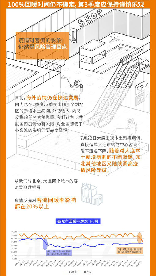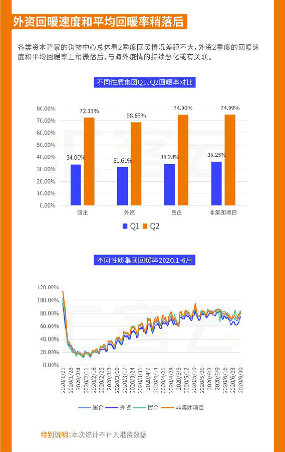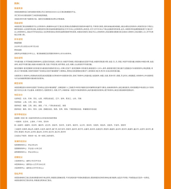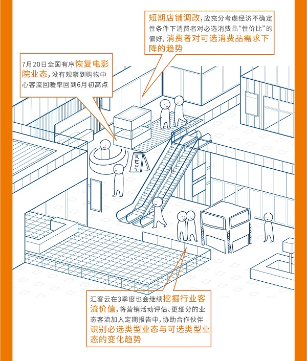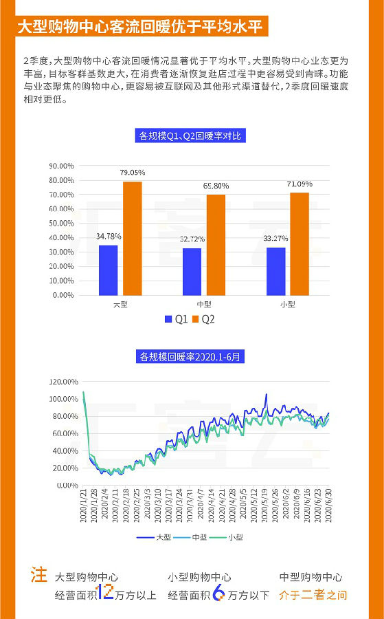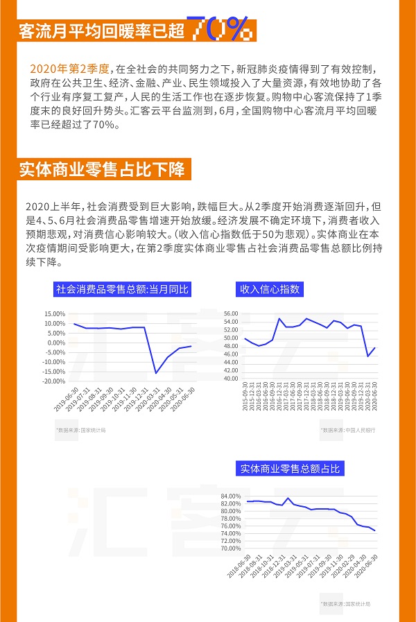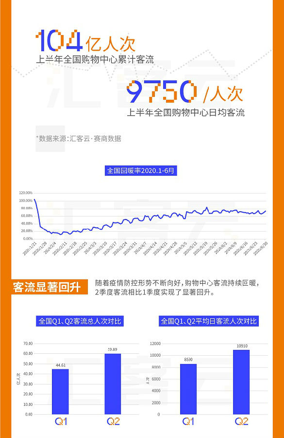 7月31日,汇纳科技旗下实体商业智能决策平台——汇客云重磅发布:《汇客云中国实体商业客流桔皮书-2020上半年报告》,根据汇客云平台监测,购物中心客流持续回暖。6月,全国购物中心客流月平均回暖率已超过70%。更详细的数据报告请看下文。