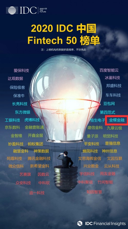 8月28日,全球著名的第三方研究机构IDC发布中国金融科技Fintech 50强榜单,金蝶金融凭借突出的科技创新能力入选该榜单,同时入选的金融科技企业还包括蚂蚁集团、腾讯金融科技、京东数科等。