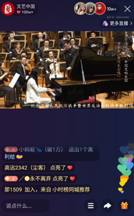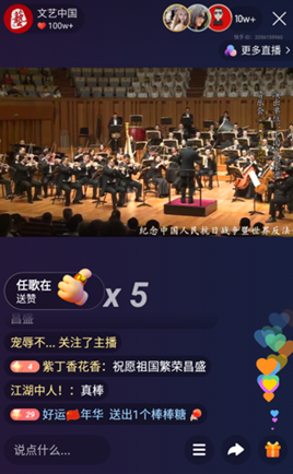 音乐会中,先后上演了《红旗颂》,根据冼星海《黄河大合唱》改编的钢琴协奏曲《黄河》,以及《黄河大合唱》等经典曲目。震撼的音乐视听盛宴也引发观看直播的广大老铁纷纷表示“热血沸腾,振奋人心”“文化经典”“金曲不朽”“气势磅礴”“听得我好感动”“心潮澎湃”,并留言表达民族自豪感以及对于伟大祖国的热爱之情与衷心的祝福。
