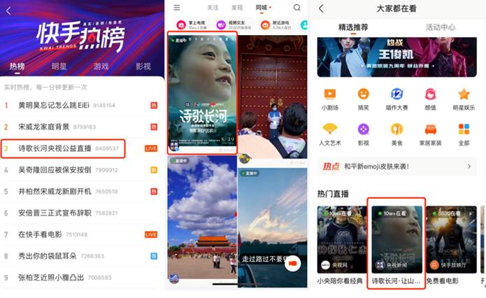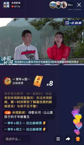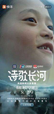 8月29日,快手携手央视新闻、中国银联推出首个诗歌公益直播项目“诗歌长河”,让更多山里孩子的才华被看见,感受他们独特的诗歌情怀与内心的纯洁。本次诗歌长河公益项目在快手全程直播,平台总曝光量达3380万,直播活动观看量达951W,直播间最高在线用户数达36.4W,总点赞数176W。