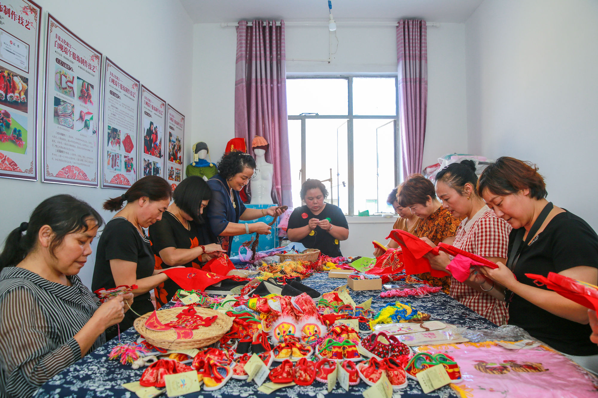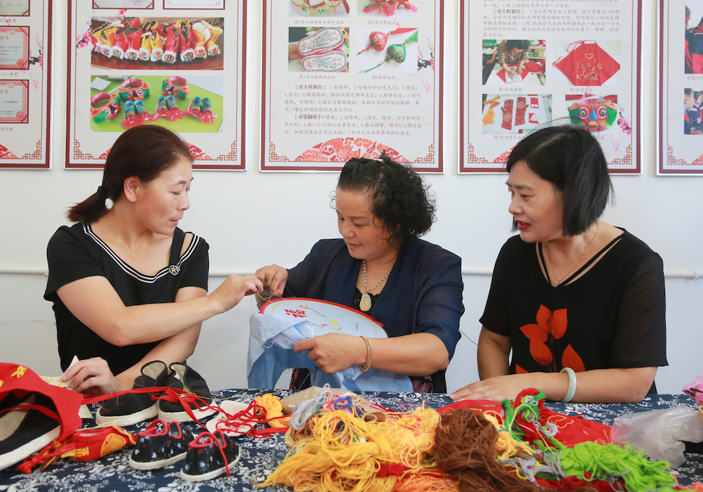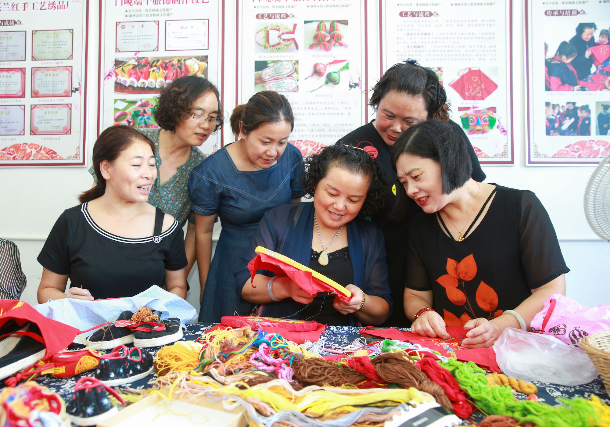 9月5日,在访贤村志愿者的组织下,村残疾人和部分低收入农户一起到兰红绣品厂,参观学习非遗刺绣技艺。经过沈兰红亲自制作、传授,精湛的手艺让在场的学生惊叹连连,现场气氛非常热闹,大家认真地学习,在老师手把手地带领下进步飞快。