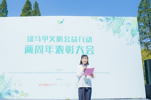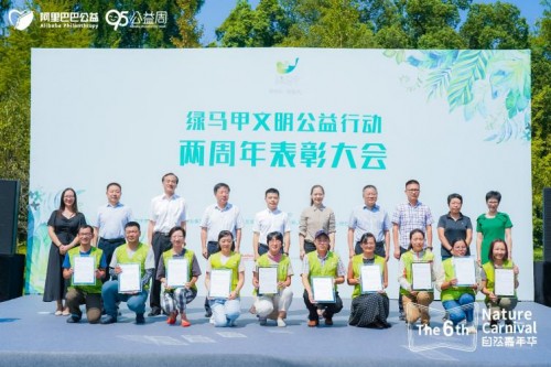 开幕式结束后紧接着进行了绿马甲文明公益行2019年度优秀绿马甲志愿者表彰大会。杭州西湖风景名胜区党委委员、管委会副主任何蕾,杭州西湖风景名胜区一级调研员邓兴顺,杭州市文明办、杭州日报、杭州市园林文物局、杭州市教育局、共青团杭州市委、杭州市科协、阿里巴巴公益基金会、桃花源生态保护基金会领导为二十名优秀绿马甲志愿者颁奖。