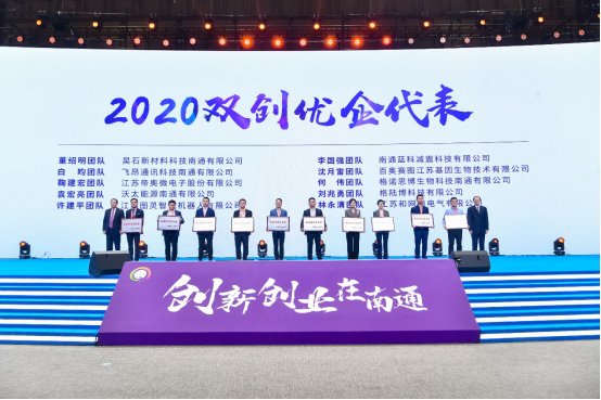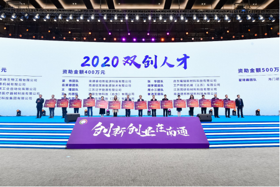 随后,江苏省委组织部副部长洪浩先生,南通市委书记、市人大常委会主任徐惠民先生以及江苏省委组织部人才工作处处长叶绪江先生,南通市政协主席、党组书记黄巍东先生分别为2020双创优企团队和获得500万、400万、300万资助的2020双创人才举行了颁授仪式。