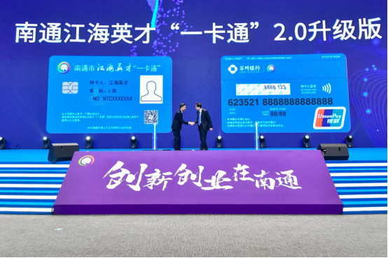 为更好的服务这些双创人才,南通市委人才办也联合苏州银行推出了南通江海英才“一卡通”2.0升级版,面向国家、省市各类高层次人才,提供“一卡、一贷、一平台”,含项目落户、住房安居、子女入学、医疗保障、绿色通道等多领域的全生命周期服务。南通市委常委、组织部部长封春晴先生和苏州银行总行行长赵琨先生一起发布了南通江海英才“一卡通”2.0升级版。