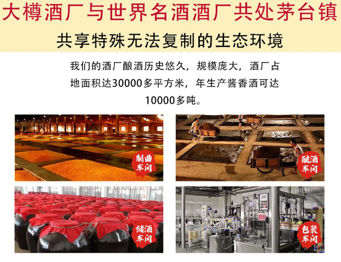大樽酒厂酿造的大曲酱香型白酒都是通过九蒸八酿,七次取酒后分别把七个轮次的原酒在无污染,无公害、含有多种对人体有益成分的朱砂土窖内天然窖藏老熟,在三年以上的窖藏过程中,通过氧化还原、酯化、挥发和物理自然变化,使酒体变得更加醇和、细腻、酱香更突出。