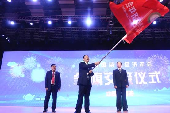 在旗手整齐划一步伐的护送下,由中国茶叶流通协会会长、国家茶叶标准化技术委员会主任委员王庆主持,全体嘉宾共同见证了中国茶业经济年会的会旗交接仪式。西双版纳傣族自治州人民政府副州长张云洪将象征着使命、希望与责任的年会会旗传递给下届年会承办单位——广西壮族自治区柳州市人民政府副市长朱富庭手中。