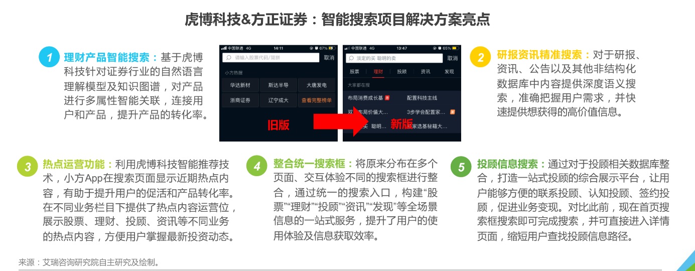 报告援引了方正证券的某项目作为证券科技应用中的典型案例,在引入虎博智能搜索技术后,建立起了信息服务的智能化首道防线优势。公开资料显示,可统计范围内,小方App应用虎博智能搜索技术后,其信息服务效率提升至少50%,从而吸引并留住更多用户。