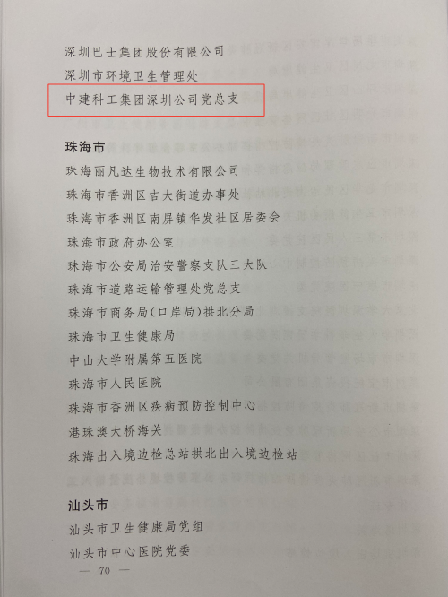 日前,广东省召开全省抗击新冠肺炎疫情表彰大会, 会议以省委、省政府名义公布并表彰在抗击新冠肺炎疫情斗争中涌现出的999名先进个人和303个先进集体,以省委名义表彰150名广东省优秀共产党员和100个广东省先进基层党组织。其中,中建科工集团深圳公司党总支荣获“广东省抗击新冠肺炎疫情先进集体”“广东省抗击新冠肺炎疫情先进基层党组织”。此前,中建科工深圳应急医院项目还获“广东青年五四奖章集体”“广东省先进集体”等荣誉。