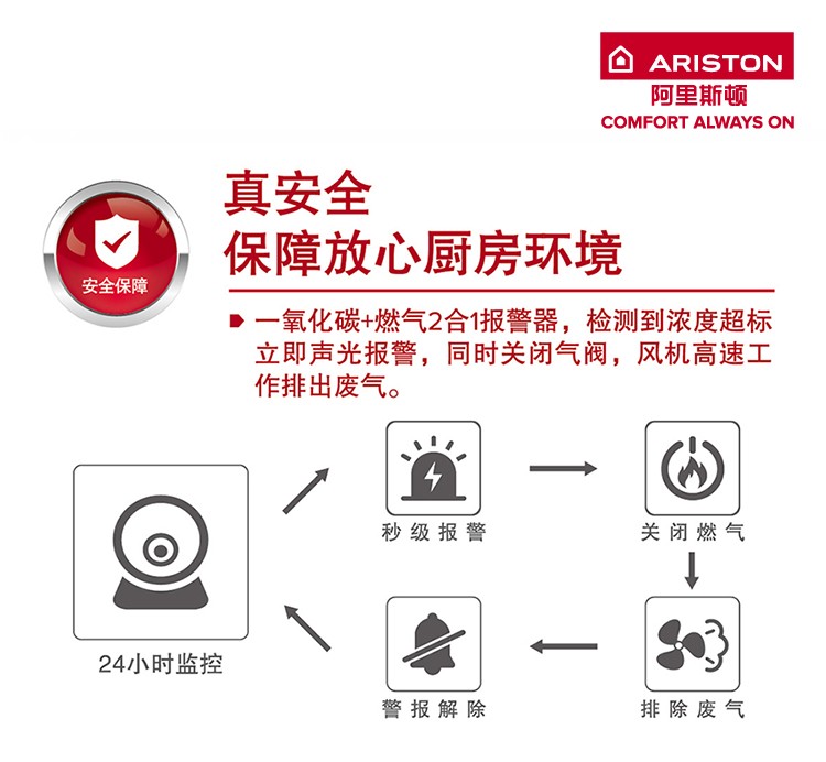解决了燃气热水器的恒温问题,另一不可忽视的环节就是使用安全性。众所周知,当室内通风不畅,热水器出现燃气燃烧不充分时,极易产生一氧化碳泄漏,进而埋下安全隐患。如果家中出现设备管道老化、燃气点火不成功甚至火焰被风吹灭等情况时,更会造成燃气泄漏。对此状况,阿里斯顿全新IPT安捷零冷水燃气热水器将安全防范“极限”升级,推出了“一氧化碳+燃气2合1报警系统”安全防护组合拳,当检测到空气中一氧化碳/燃气浓度超标时,会立刻发出声光报警,同时关闭气阀,风机高速工作排出有害气体,严守居家安全百分百。