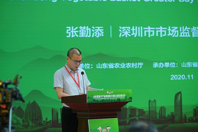 深圳市市场监督管理局一级调研员张勤添代表深圳市市场监督管理局向来自山东菜篮子的业界朋友和深圳市的采购商代表表示热烈欢迎,向亲临展会指导的山东省农业农村厅领导表示衷心感谢! 张勤添表示,深圳作为一个拥有2200多万管理人口的特大城市,就食用农产品而言,市场需求十分旺盛,米菜肉蛋百分之九十以上依靠外来输入。为贯彻落实总书记关于落实“米袋子省长责任制、菜篮子市长负责制”的指示精神,全面创建“食品安全示范城市”,深圳市市场监管部门始终把米袋子菜篮子工程摆在更加突出的战略位置,从优质农产品认定、产品深加工、生产标准化、圳品品牌化方面入手,加大工作力度,发掘市场空间,全面贯彻落实党和政府的惠民政策。总书记在深圳经济特区建立40周年庆祝大会讲话时强调,要“让人民群众的获得感成色更足、幸福感更可持续、安全感更有保障”。张勤添希望通过展洽会搭建产销对接平台,强化“圳品”品牌衔接,在山东省评定一批“圳品”菜篮子基地,发挥粤鲁各自优势,实现多方互利共赢。
