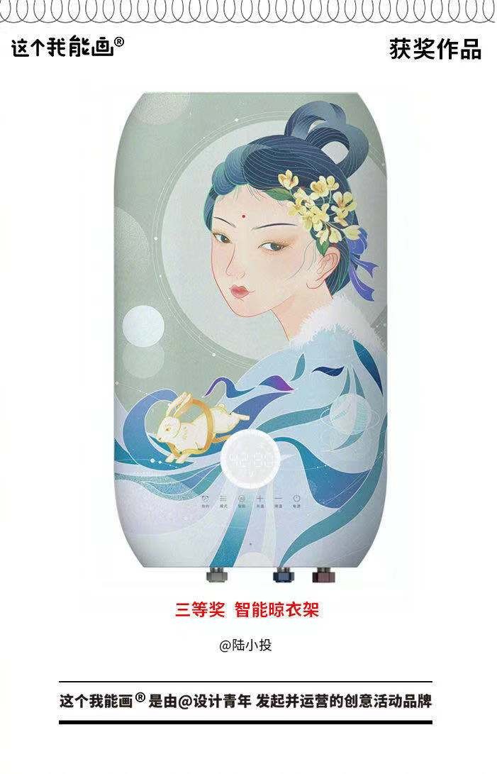 活动主题是“我和嫦娥有个约会”,所以我想,广寒宫的生活嫦娥可能已经厌倦了吧,我想带她离开那里,来人间玩一玩。因为活动是在速热热水器的表面作画,所以我将圆形的温度显示屏设计成月亮的样子,就像我们一个在人间一个在天宫,都看着同一个月亮,这是我们唯一的连接。