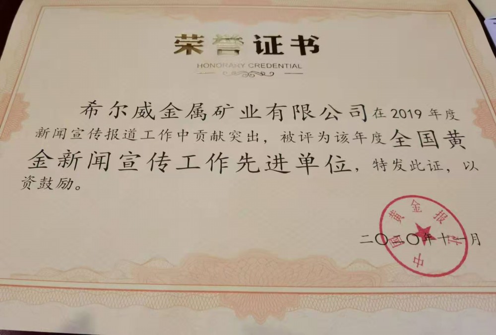 近日,2020年全国黄金行业新闻宣传工作会议暨党建工作会议,在江西德兴圆满落幕。我公司被评为2019年度“全国黄金行业新闻宣传先进单位”。本次会议旨在引领和推动行业各成员单位深入学习贯彻落实习近平总书记关于新闻舆论工作和党的建设工作的重要论述,加快推进媒体深度融合发展,为黄金行业高质量发展提供坚强的思想保证和强大的精神力量。大会对一批创新深入开展新闻报道工作的企业和单位颁发了奖项,其中,希尔威金属矿业有限公司荣获“全国黄金新闻宣传工作先进单位”。