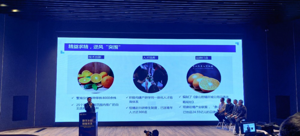 “象山三面环海,两港相拥,域内生态环境优美,山、水、海相融相映,素有‘东方不老岛、海山仙子国’之美誉,独特的地理位置和优越的生态环境,孕育出了种类繁多、品质优异、营养丰富的特色农产品”,象山县政府副县长吴志辉在大会上分享了象山县数字化农业建设方案及经验,“得益于我们‘精益求精’的态度,让象山柑橘逆势‘突围’”。