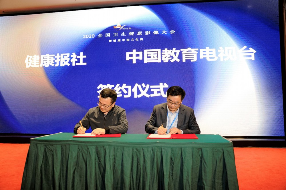 健康报社社长、党委书记邓海华(右)与中国教育电视台副台长吕学武(左)签约