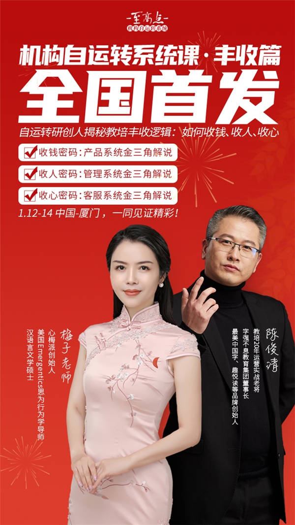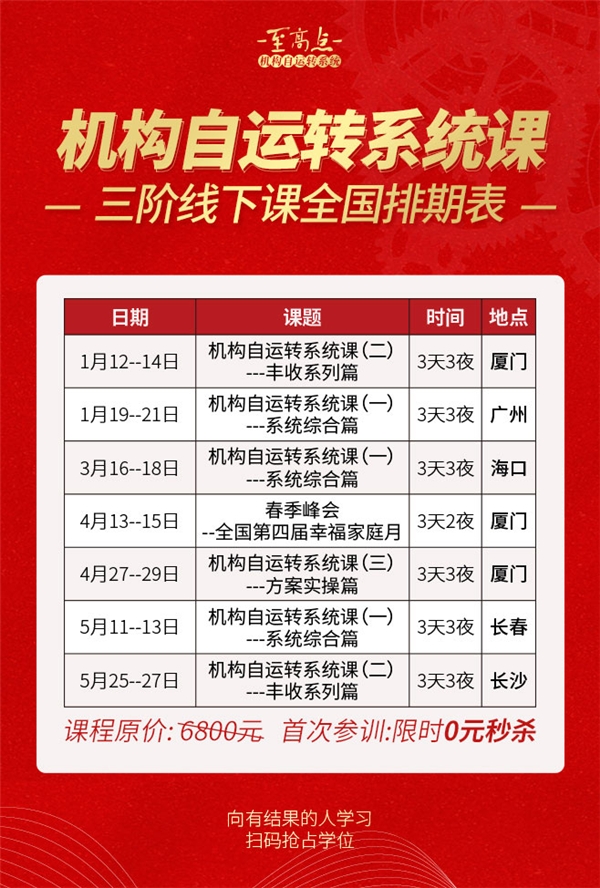 1月12至14日《机构自自运转系统课-二阶丰收篇》将在厦门盛大开幕,《丰收篇》课程将为校长们带来以下高能知识点:丰收系列之收人收钱收心的道法深度解析;产品、管理、服务三大系统9大模块的建构理论和体系;校区营收的8个盈利模式深度解析;机构引流转化裂变的循环系统打造;产品矩阵方案设计现场指导实操完成;2021年年度规划现场指导实操完成;微软公司长期使用的人才系统--EG专业课;联营合伙模式的方案详解等。