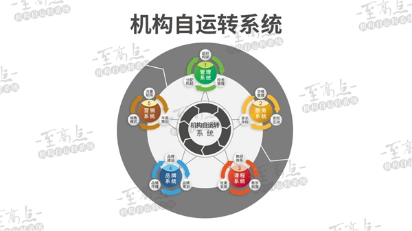 至高点机构自运转系统是资深教育策划人陈俊清老师及团队借助中国古代哲学“三才者--天地人”金三角和“金木水火土”相生相克五行图,用宇宙的规律结合现代化教育企业管理理论实践体系,以大量校区落地实操解决方案和运营大数据为基础;打造出来的一套适合当下教育培训机构的综合运营系统。