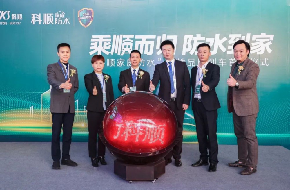 接下来,由科顺股份集团总裁方勇,科顺民建集团总裁徐汝意,全国优秀经销商代表祝建华、段耀泉,家装公司代表刘喜林、黄志强上台共同按下 “科顺家庭防水品牌列车”启动球,宣布科顺家庭防水品牌列车正式首发。
