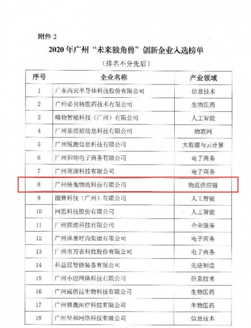 2021年1月19日,由广州市科学技术局指导,广州市科技创新协会、《快公司Fast Company》联合主办的《2020发现广州“独角兽”创新企业榜单》在上交所南方中心正式发布。快运兔凭借在物流服务领域的创新优势与发展势头,荣获2020年广州“未来独角兽”创新企业称号,是物流产业领域唯一上榜的企业。