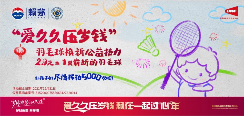 为何会在春节这样一个阖家团圆的节日里发起“爱久久压岁钱”羽毛球换新公益接力活动?赖茅相关负责人表示,“压岁钱”是一个传统年俗,希望大众在春节给自己和亲朋好友的孩子发“压岁钱”的时候,也可以关注到拥有羽毛球梦想,但却没有羽毛球装备的孩子们。同时赖茅也希望通过这个活动,让更多的人关注到少儿羽毛球运动的发展。