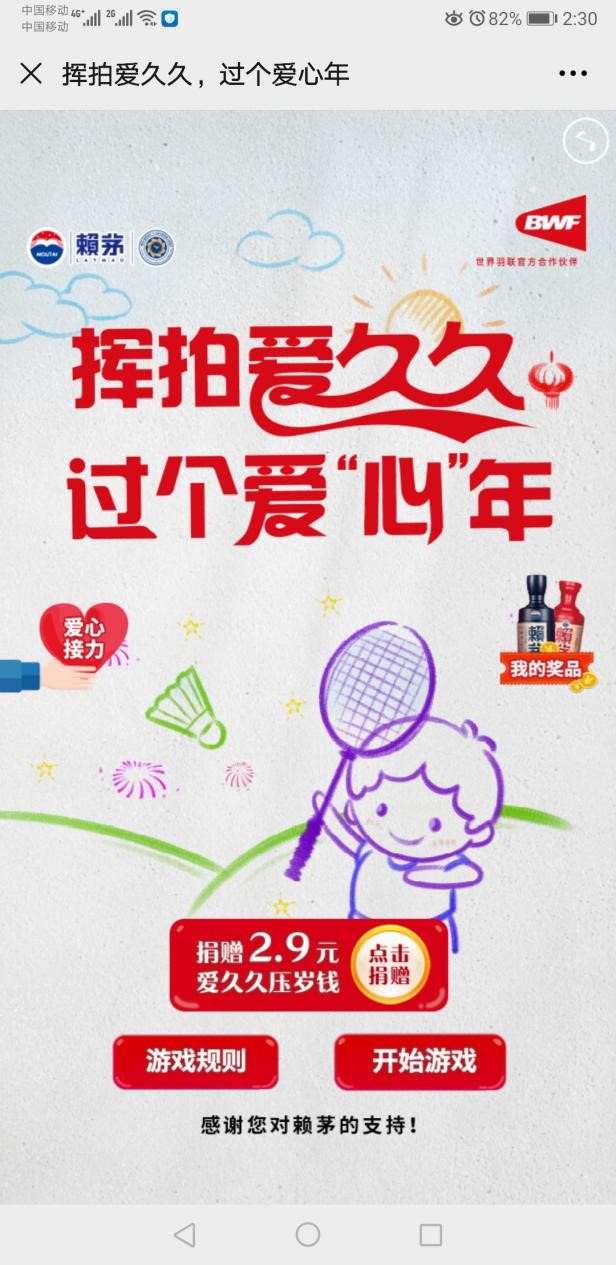 赖茅认为公益是人人可参与的,因此除了捐钱之外,更通过有趣的形式来号召大家为公益助力。据了解,赖茅“挥拍爱久久,过个爱心年”H5小游戏也将于日前上线。普通公众可以通过扫码进入游戏,而每个人的挥拍次数都将折算成相应的金额,由赖茅捐赠给“赖茅·爱羽成长”少儿羽毛球发展公益基金。游戏也将累计所有玩家成功挥拍次数,每当所有玩家挥拍总次数到达5000次,赖茅就向“赖茅·爱羽成长”少儿羽毛球发展公益基金捐出2.9元。公众在挥拍献爱心之余,还可以参与抽奖,抽取赖茅传承酒、端曲酒以及赖茅精美纪念品等。