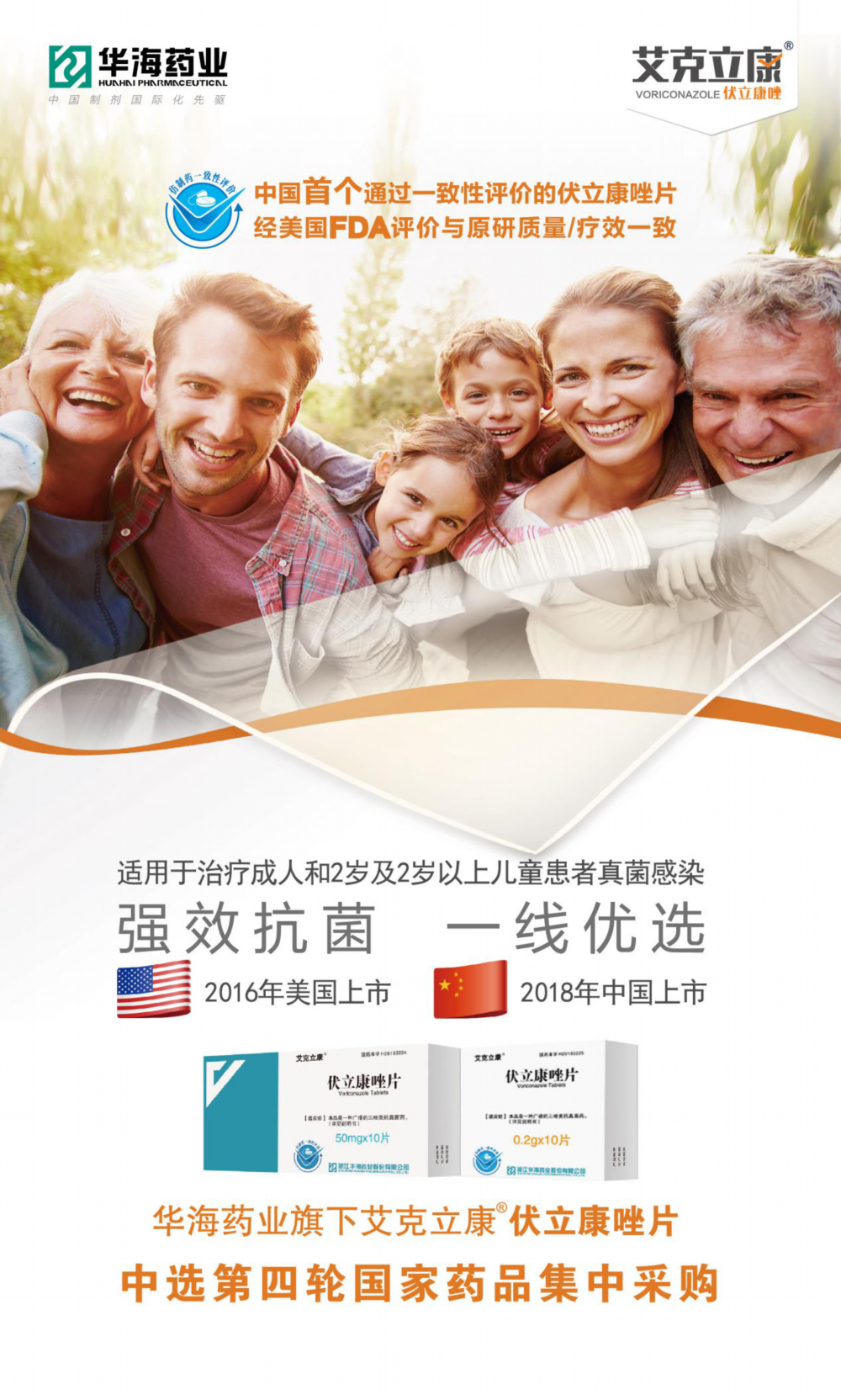 此前,伏立康唑口服剂型入选了个别省份的带量采购名单,如湖南省抗生素的带量采购,华海药业的艾克立康 中选,极大地提高了该区域患者的药品可及度。艾克立康 伏立康唑片是华海药业首个抗感染领域产品,于2018年上市,是国内首家通过一致性评价并获批新适应症(预防接受异基因造血干细胞移植(HSCT)的高危患者中的侵袭性真菌感染)的伏立康唑片剂,也是湖南省伏立康唑的中选厂家之一。据悉,此次华海艾克立康 伏立康唑在与一众原研和通过一致性评价厂家的角逐中突出重围,中选国家集采,在保证药品质量的基础下,进一步扩大了患者的可及范围,把优质药品以更优价格送至广大的患者手中。华海药业作为中国最早扬帆出海的医药企业,凭借着全球化布局和原料药制剂一体化的优势,积极投身于前几轮的国家集采中,在前三轮国采中已有12个品种中标。