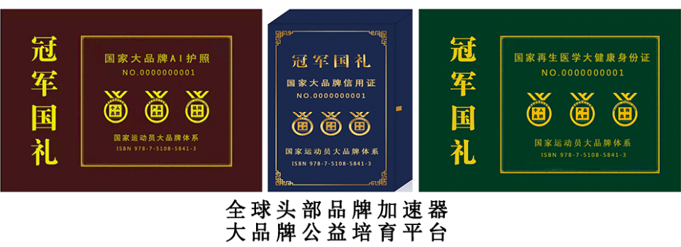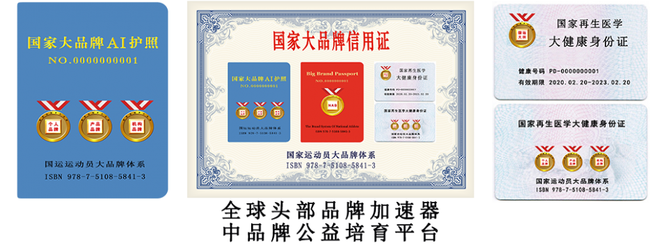 全球头部品牌加速器中级品牌培育:国家大牌,又称为国家大品牌,从品牌产业的维度划分为中品牌产业,其核心产业价值为公益培育品牌的三度(识别度/传播度/应用度),通过中国品牌扶贫计划(24家央媒2018/9/24报道)实现,适用于产业互联网产业理论与实践应用。国家运动员大品牌体系以国家运动员为公益带动群体,通过《国家大品牌AI护照》《国家大品牌信用证》《国家再生医学大健康身份证》,实现高效靶向应用。