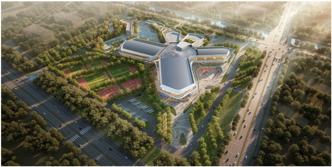 项目整体外观呈五指形,设计灵感来源于细胞分裂,寓意互动交流,生生不息。工程建设秉持“创新、协调、绿色、开放、共享”的发展理念,为当地居民拓展幸福空间,建成后将有力带动全民健身的氛围。