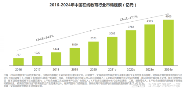 据艾瑞咨询发布的《2020年中国在线教育行业研究报告》指出,2020年在线教育行业市场规模同比增长35.5%,达到2573亿元。在各条细分赛道中,素质教育增长最为显著,从2016年的3.7%增长到了2020年的24.5%。