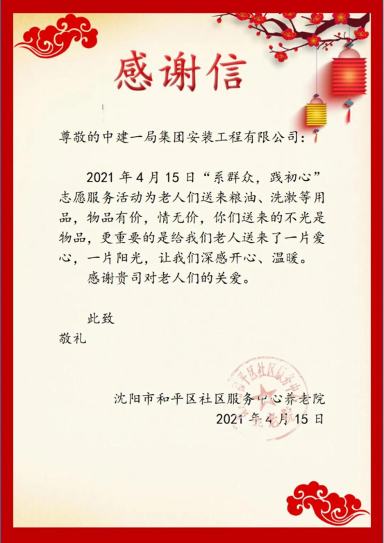 敬老爱老是中华民族的传统美德。老年人是社会的弱势群体,关爱老人是央企义不容辞的责任。中建一局安装公司东北分公司把企业的关爱送进了养老院,送到了老人的身边,真正的为群众办实事、办好事。