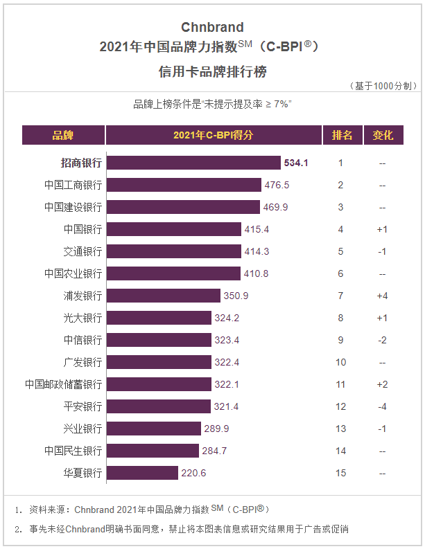 4月20日,品牌评级权威机构Chnbrand公布2021年(第十一届)中国品牌力指数 (C-BPI)品牌排名,招商银行信用卡再次蝉联信用卡类第一,这也是招行信用卡第10次问鼎中国信用卡行业品牌力第一名。