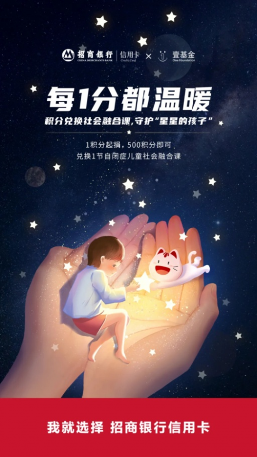 “小积分微慈善”是招行信用卡联手壹基金搭建的慈善平台,持卡人仅需1积分即可参与捐赠,每满500积分招行信用卡就代持卡人捐出一堂自闭症儿童社会融合课,课程内容包括语言训练、感统训练、音乐训练、游戏训练等。捐赠方式也很简单,用户只要打开掌上生活App,进入积分板块,点击就能完成捐赠。