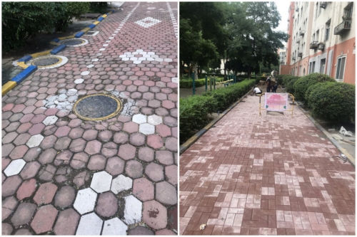 “我在这里住了十几年了,单元门门前道路是每天出行的必经路,长年累月路面难免有些破旧,很多地砖都破损了,有时下雨,踩到地砖上,还会从地砖缝隙往上返水。这次路面翻新可是给我们业主出行带来方便了”,居住在城市花园的张大爷说道。在多次经过现场勘察、讨论及征询业主意见后,6月30日城市花园小区开启人行道整修工程,将部分单元门前破损人行路面重新铺设,减少小区内道路交通安全隐患。不仅让小区的“颜值”提升,“肌体”状态也更为年轻。