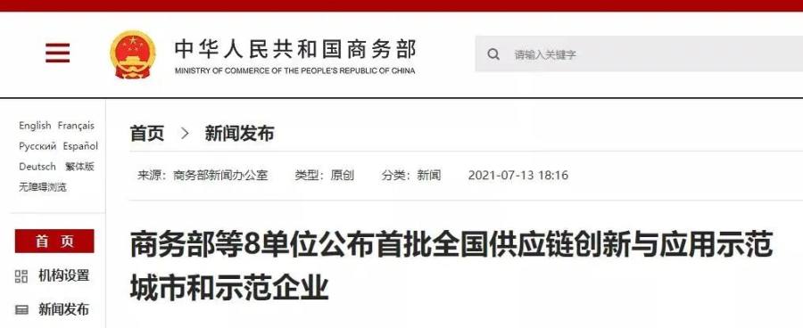 日前,商务部、工业和信息化部、生态环境部、农业农村部、人民银行、市场监管总局、银保监会、中国物流与采购联合会等8单位联合印发通知,公布首批全国供应链创新与应用10个示范城市和94家示范企业,卡奥斯COSMOPlat入选本次示范名单。