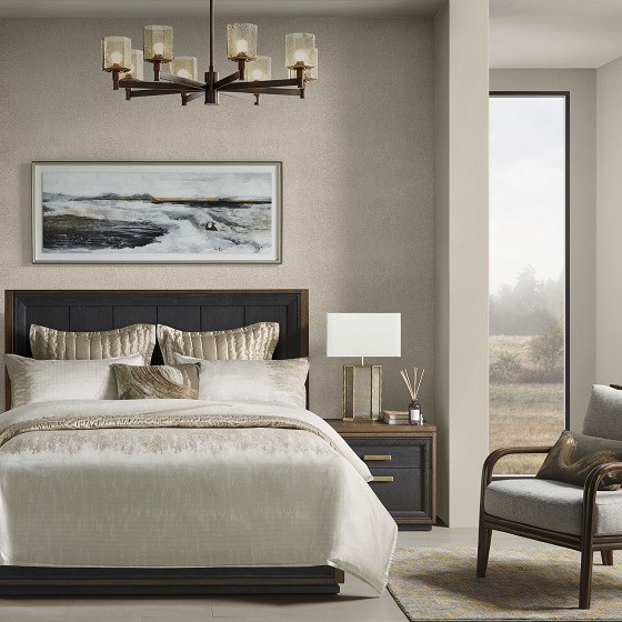 无论是色彩、质感还是层层交叠、似水如墨的大气图纹设计都推崇贴近自然,再搭配同样简朴、沉着有质的家具后,简繁平衡,刚柔相济,令人如沐清风。