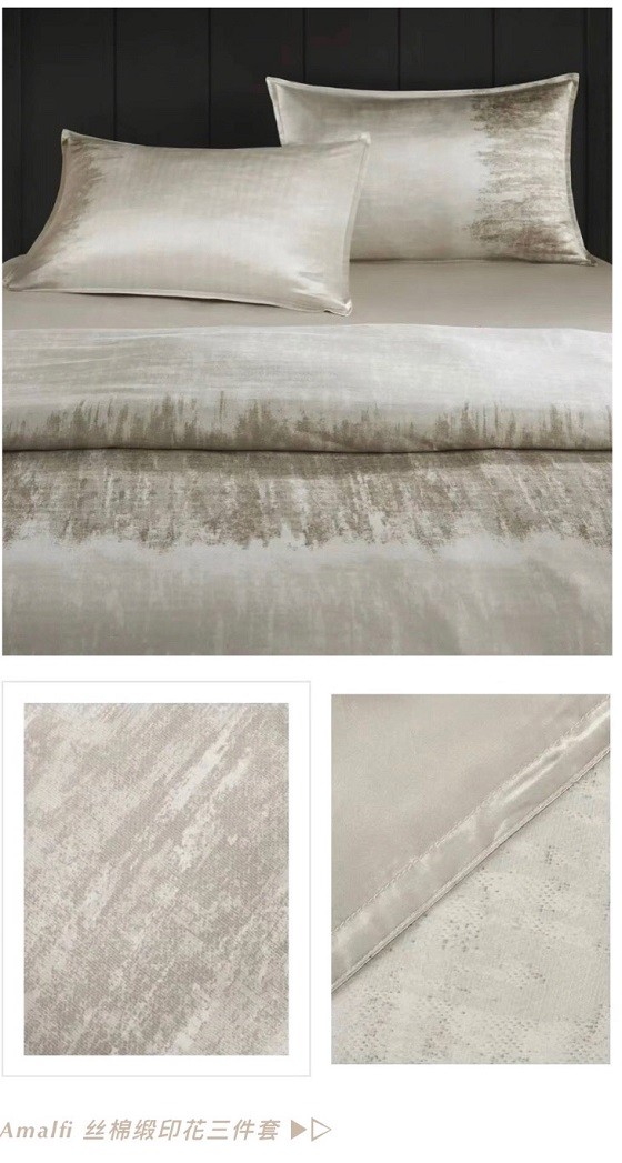 Amalfi采用了经纱100%桑蚕丝、纬纱100%棉的面料,并且在原料品质上作了严格把关,加之贡缎织就后,使其既有真丝的丝滑质地,又有了棉吸湿、透气的特性。
