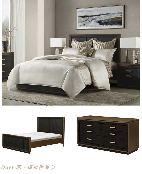 造型大气沉稳的Duet床主材选用美国红橡木,木材表面还经过拉毛处理,演绎出更为浓郁的肌理感。梳妆柜以大小不同的六抽满足收纳空间的需求,也于橡果色与黑可可色的深浅辉映中,平衡着功能性与装饰度。